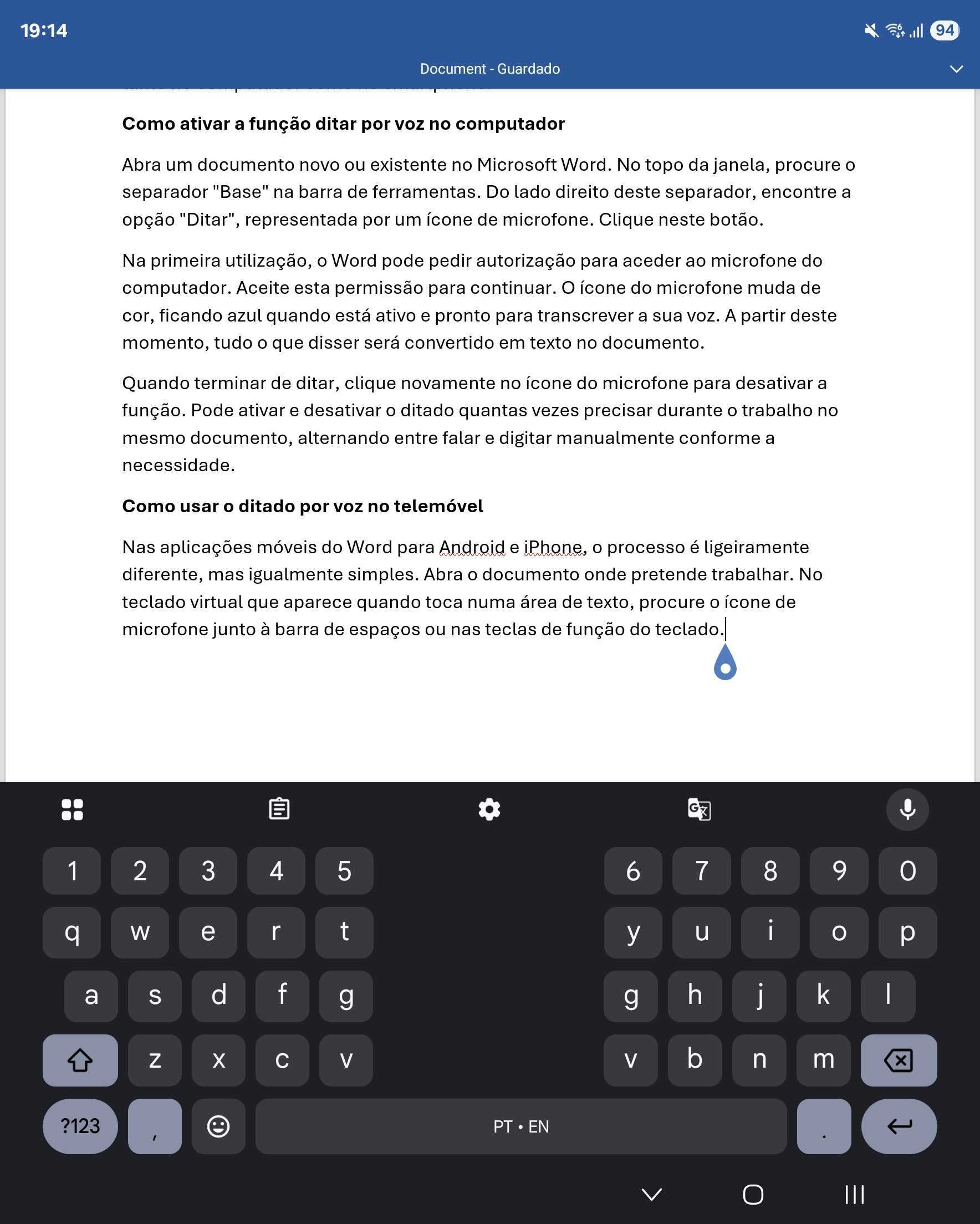 Nas aplicações móveis do Word para Android e iPhone, o processo é ligeiramente diferente, mas igualmente simples. Abra o documento onde pretende trabalhar. No teclado virtual que aparece quando toca numa área de texto, procure o ícone de microfone junto à barra de espaços ou nas teclas de função do teclado.