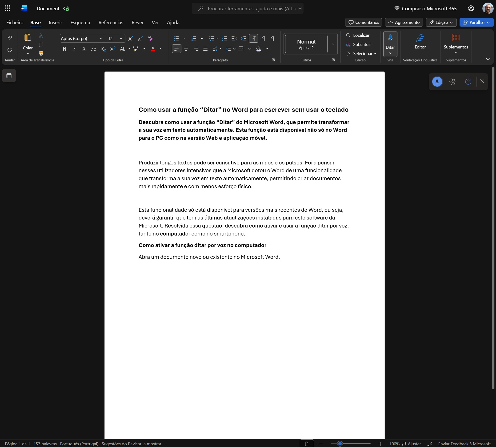 Toque no ícone do microfone. O ícone fica azul quando está ativo. Comece a falar e o Word vai transcrevendo as suas palavras em tempo real. Para parar a gravação, toque novamente no ícone. Na primeira utilização, o sistema operativo vai pedir permissão para que o Word aceda ao microfone.